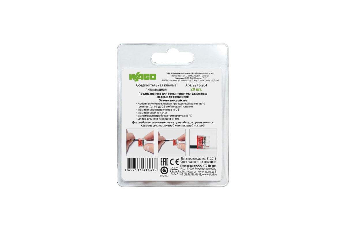 КЛЕММА 4-проводная 2,5 мм2 24 А 2273-204 WAGO