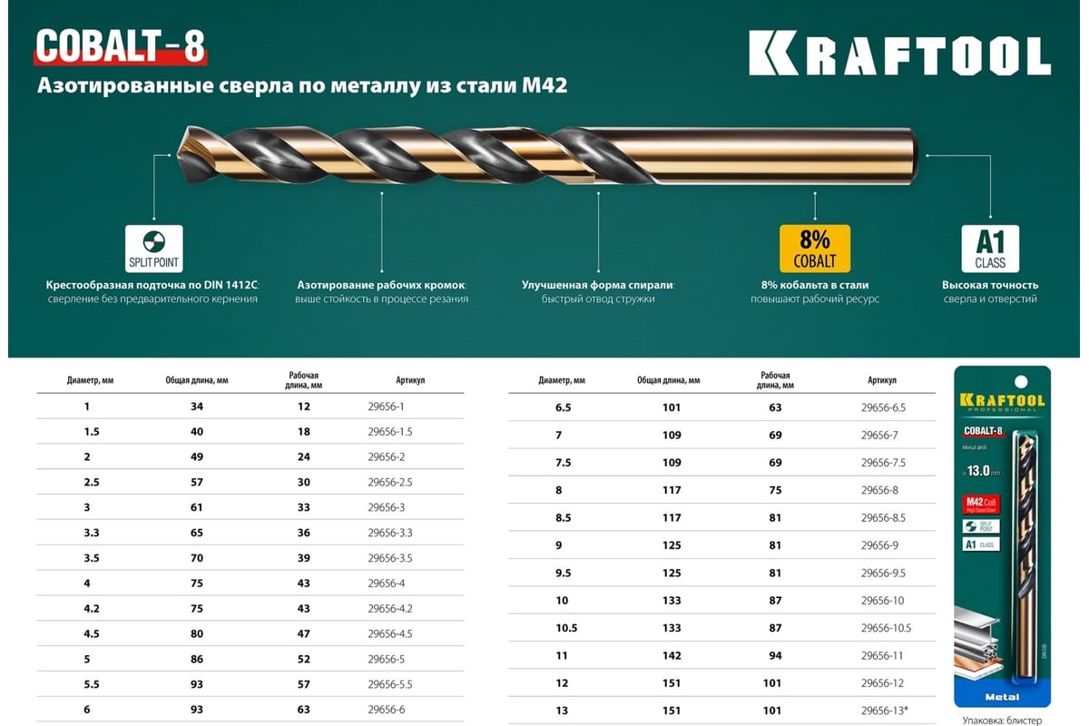 СВЕРЛО спиральное 8,0х75х117 мм по металлу М42 HSS-Co 8% цилиндр KRAFTOOL