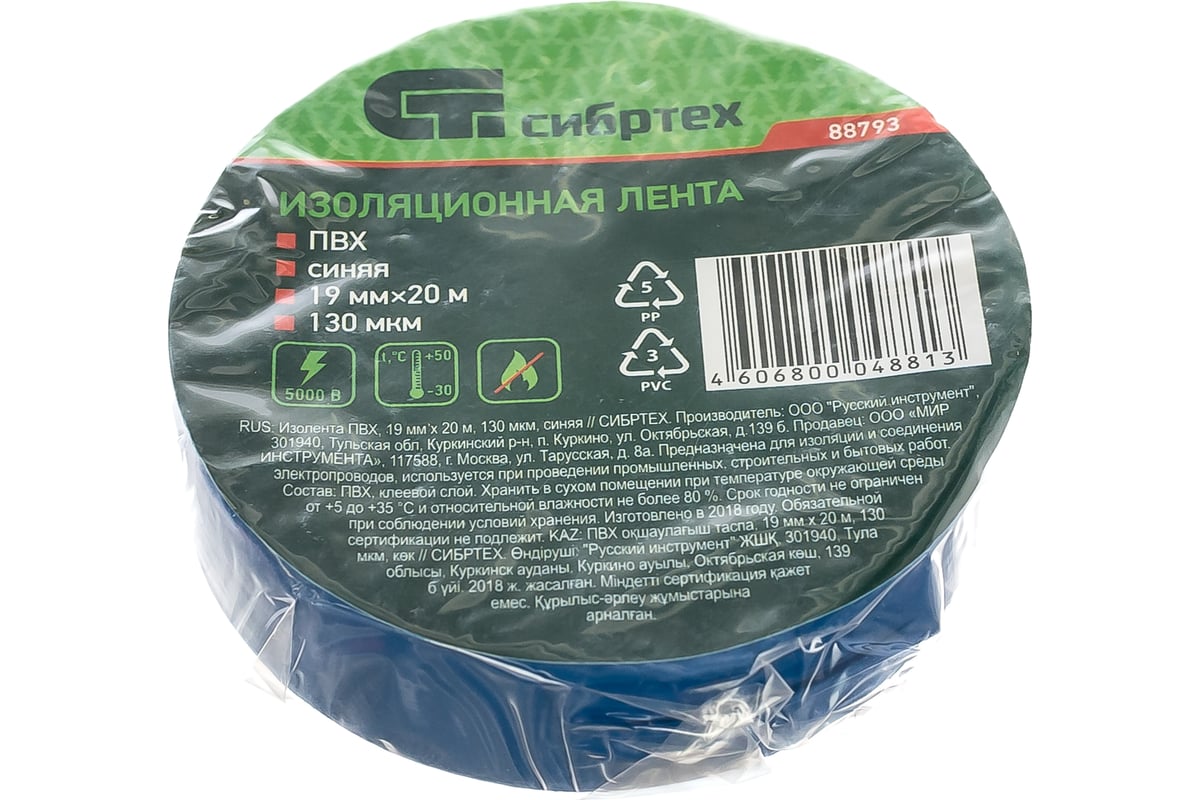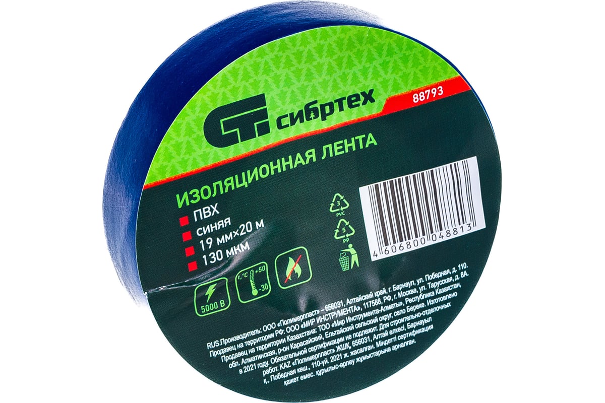 ИЗОЛЕНТА ПВХ 19 мм 20 м СИБРТЕХ цв. синий